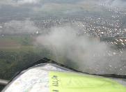 Am Albrand dann das was ich schon befürchtet hatte. Die Wolken sitzen auf. Was nun. Also am Albrand entlang Richtung Osten. Nach einiger Zeit tut sich tatsächlich eine grössere Lücke auf und ich kann die Albkante passieren. Die Sicht ist nicht besonders aber noch ausreichend. Ich wäre gerne höher geflogen um nicht alle Wälder und Dörfer umfliegen zu müssen. Die relativ niedrige Flughöhe zwingt mich dazu, damit bei unerwartetem Motorausfall jederzeit ein Landeplatz im Gleitwinkelbereich ist.