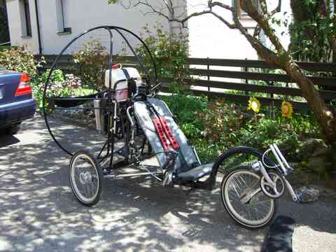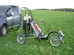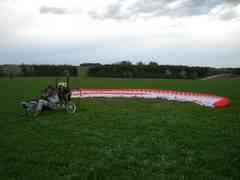 2008 ist das Jahr der Bandscheibenvorfälle in unserer Familie. Ich wurde im Oktober operiert, danach Reha und nun 2009 endlich wieder beschwerdefrei. Der Doc empfiehlt nach so was nichts schweres zu tragen. Ok. Dann müssen eben Räder dran - an den Motorschirm. Und mit Pedalen kann man auch noch radfahren, wenns mit dem Fliegen mal nicht sein soll. Also den einschlägigen Gebrauchtmarkt abgeklappert und tatsächlich ein Flyke erwischt. Direkt von Fresh Breeze. Einen stärkeren Motor braucht es leider auch. Ein gebrauchter Simo wurde gleichzeitig in Hannover angeboten. Da kann ich ja alles auf einer Tour erledigen und beides kaufen. Das Flyke sollte 111 cm breit sein. Mein Kofferraum ist 112 cm breit - perfekt. Leider ist entweder der Kofferraum kleiner oder das Flyke breiter. Jedenfalls in Hannover habe ich festgestellt, dass das doch nicht passt. So bin ich dann später auch noch zu nem Anhänger gekommen. Das Flyke jedesmal auf Kofferraum-Grösse zu demontieren nervt nämlich relativ schnell. Das sind halt die ungeplanten Folgekosten. Meinen guten alten Solo Motor konnte ich danach auch rasch verkaufen. Finanziell prima. Aber war nicht einfach sich von dem guten alten Stück zu trennen.